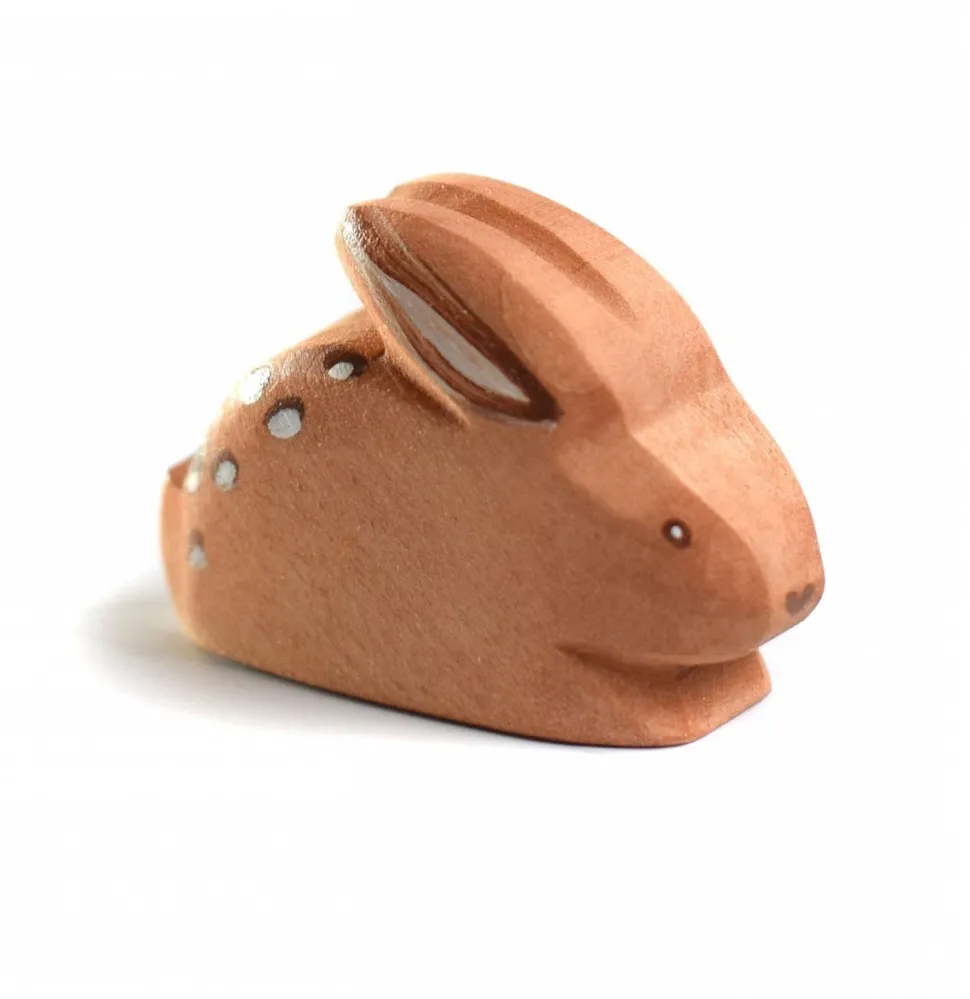 Dit is het konijn van bumbu toys gemaakt van esdoornhout, afgewerkt met niet giftige verf. Dit konijn is lekker aan het uitrusten. Het konijn is 5.3 cm lang.