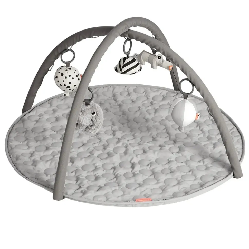 Hang het speelgoed in 13 verschillende standen aan de bogen. Croco knettert bij aanraking, Elphee rammelt, het spiegeltje glimlacht terug en de ballonnen bevatten gong en een bel – allemaal voor de stimulatie van je baby.