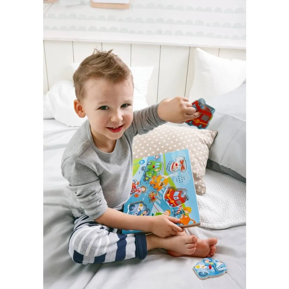 Tatu-tatu, de hulpvoertuigen zijn er! Ze hebben veel werk in de stad, want op het grote kruispunt is een ongeluk gebeurd. Als een van de 6 houten puzzelstukken juist in het puzzelbord wordt gelegd, klinkt het bijbehorende geluid. Dat is leuk en houdt de k