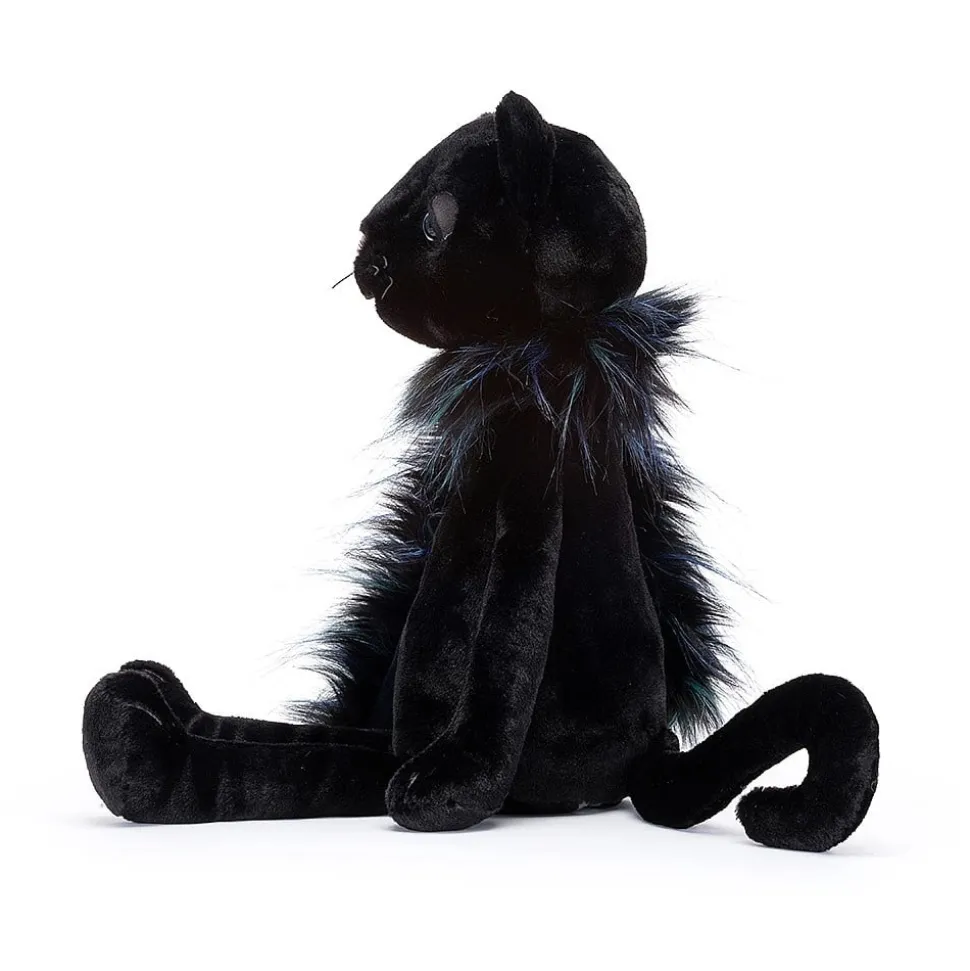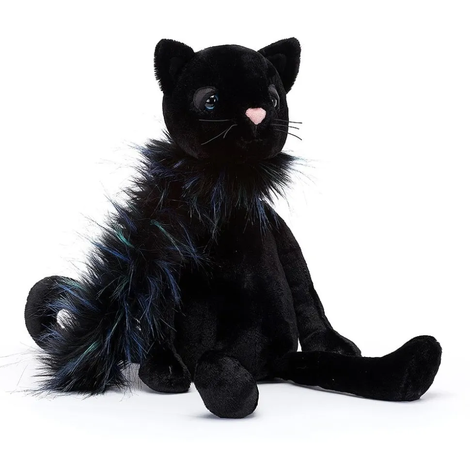 Koninklijk lui, Glamorama Cat houdt van weelderige kussens om op te dutten! Deze stiekeme, inktzwarte kat van Jellycat draagt een prachtige boa van pauwblauw pluisjes!
