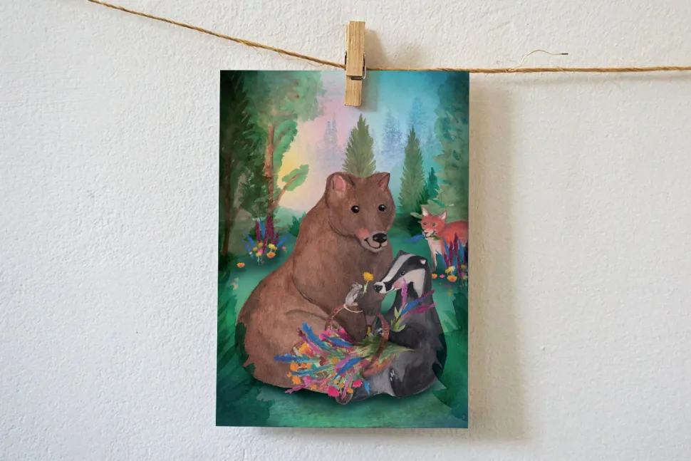 Kaart bosdieren bedankt met bloemen! Een lieve originele illustratie die verstuurd kan worden om iemand te bedankten, hart onder de riem te steken of gewoon zomaar. Maar ook mooi voor aan de muur. Daarnaast kan je hem natuurlijk ook bij een cadeau stoppen