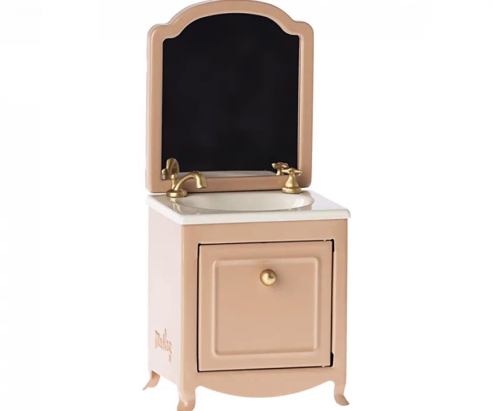 Een prachtig item voor de koninklijke badkamer in het Maileg muizenkasteel. Het heeft een kleine kast onder de gootsteen en natuurlijk ook een spiegel. Afmeting 6.5x15cm.