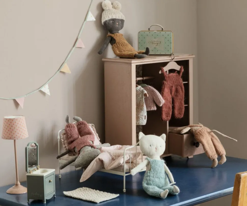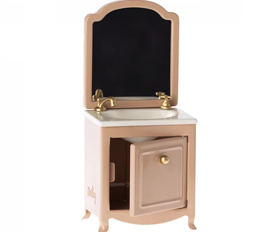 Een prachtig item voor de koninklijke badkamer in het Maileg muizenkasteel. Het heeft een kleine kast onder de gootsteen en natuurlijk ook een spiegel. Afmeting
