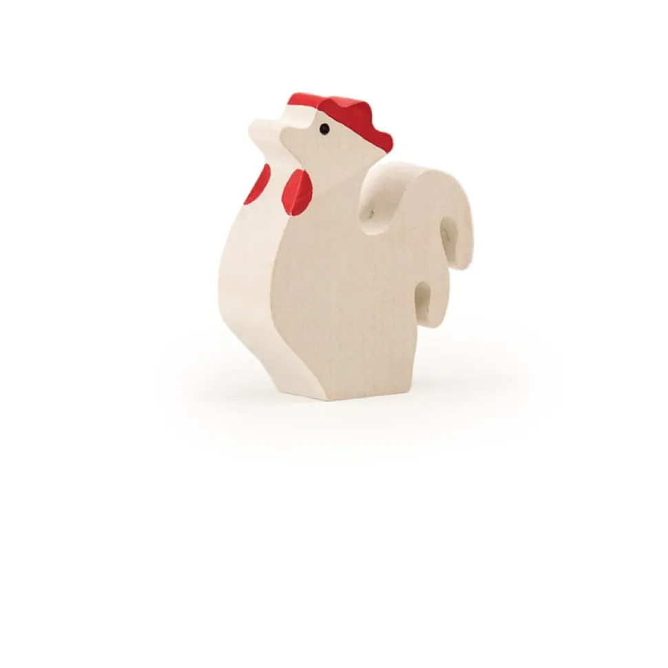 Deze haan van Trauffer staat rechtop en is met de hand gemaakt van lindehout in Zwitserland, de gebruikte verf is vrij van chemicaliën. De witte haan is robuust genoeg om mee te spelen. Hoogte: 4 cm.