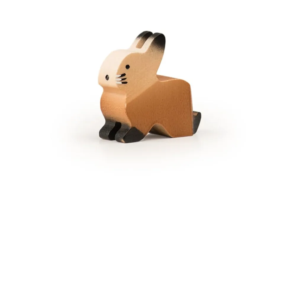 Deze haas van Trauffer zit en kijkt recht voor zich uit en is met de hand gemaakt van lindehout in Zwitserland, de gebruikte verf is vrij van chemicaliën. De haas is robuust genoeg om mee te spelen. Hoogte: 3 cm.