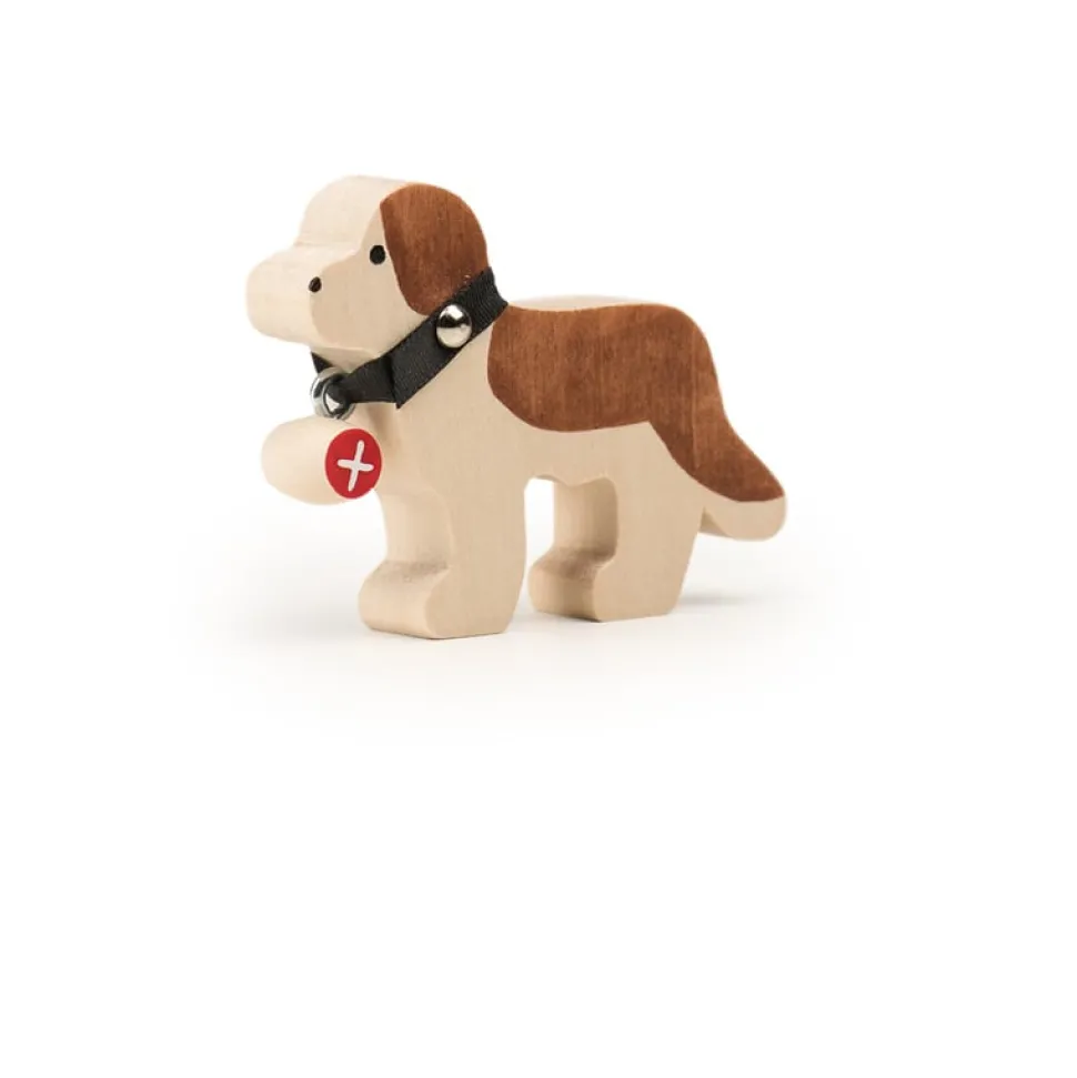Dit magneetdier in de vorm van een Sint Bernard Hond van Trauffer is met de hand gemaakt van lindehout in Zwitserland, de gebruikte verf is vrij van chemicaliën. De Sint Bernard heeft een tonnetje om zijn hals. Hoogte: 5.5 cm.