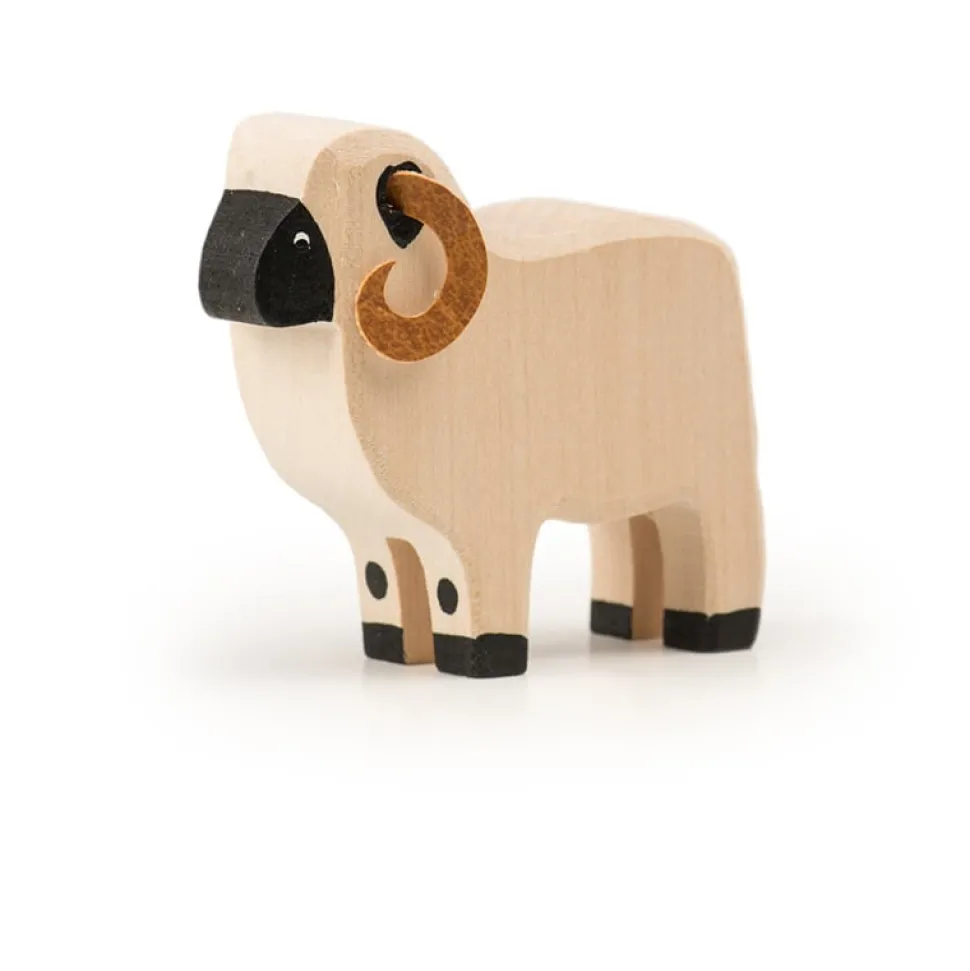 Dit zwartneusschaap van Trauffer staat rechtop en is met de hand gemaakt van lindehout in Zwitserland, de gebruikte verf is vrij van chemicaliën. Het schaap is robuust genoeg om mee te spelen. Hoogte: 6.5 cm.