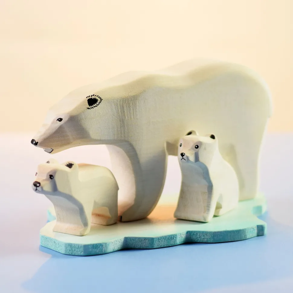 Dit is de ijsberen set op een ijsschots van het Roemeense merk bumbu toys, gemaakt van esdoornhout en afgewerkt met niet giftige verf. De set bestaat uit 3 ijsberen en een ijsschots. Overige dieren en accessoires zijn optioneel verkrijgbaar in onze websho