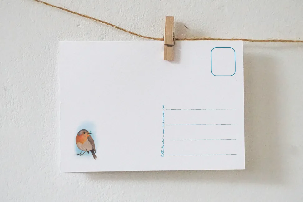 De illustratie van de kaarten van Lotte Drouen zijn door haar persoonlijk met de hand getekend en worden in kleine oplages gedrukt op mooi en dik structuurpapier. Het is zo net een klein schilderijtje. Ook de achterkant van de kaart heeft een mooi ontwerp met kleurrijke lijntjes voor de naam, adres, woonplaats en postzegel en natuurlijk ook nog een leuke illustratie.