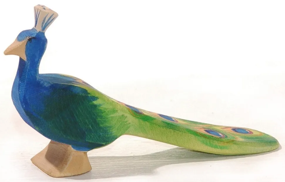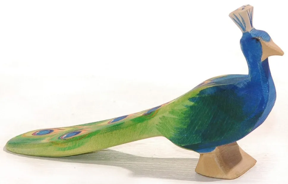 Deze pauw kijkt fier omhoog. Deze pauw van Ostheimer is met de hand van hout gemaakt en beschilderd. Hoogte: 7.5 cm