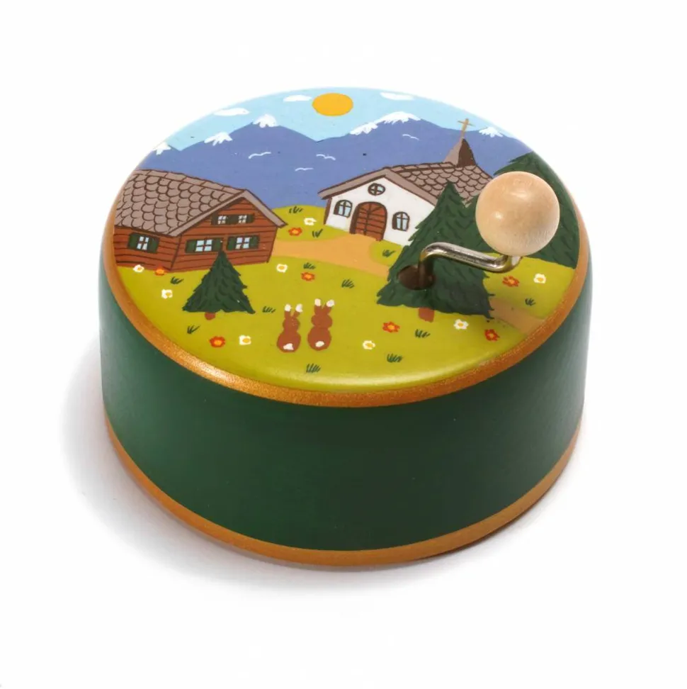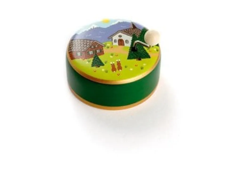 Een muziekdoosje of draaidoosje van Weizenkorn met daarop een boerderij landschap geschilderd. Hoor wat voor mooie melodie (Voorjaarslied) er gaat klinken als je aan de hendel gaat draaien. Hierbij valt de kleine zo in slaap.